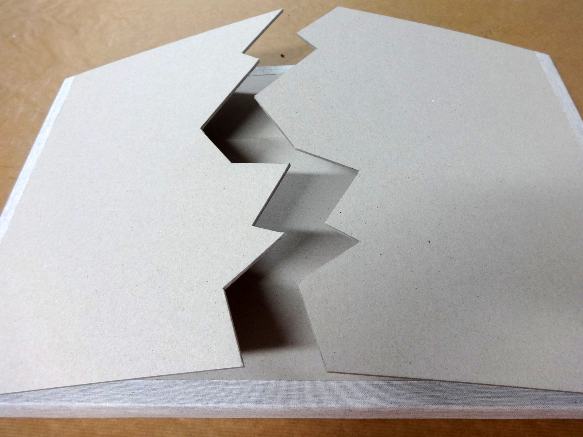Aquest és un encàrrec especial de l’artista Víctor Ramírez. Em va demanar enquadernar la seva obra “Tierra temblar contigo”. I a l’hora de fer-li un estoig protector vam estar valorant diferents opcions i se’ns va ocórrer fer un estoig estil japonès en gran. I en Victor va dibuixar una esquerda per obrir l’estoig.