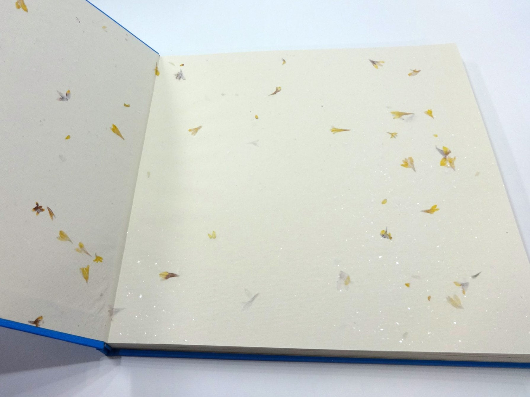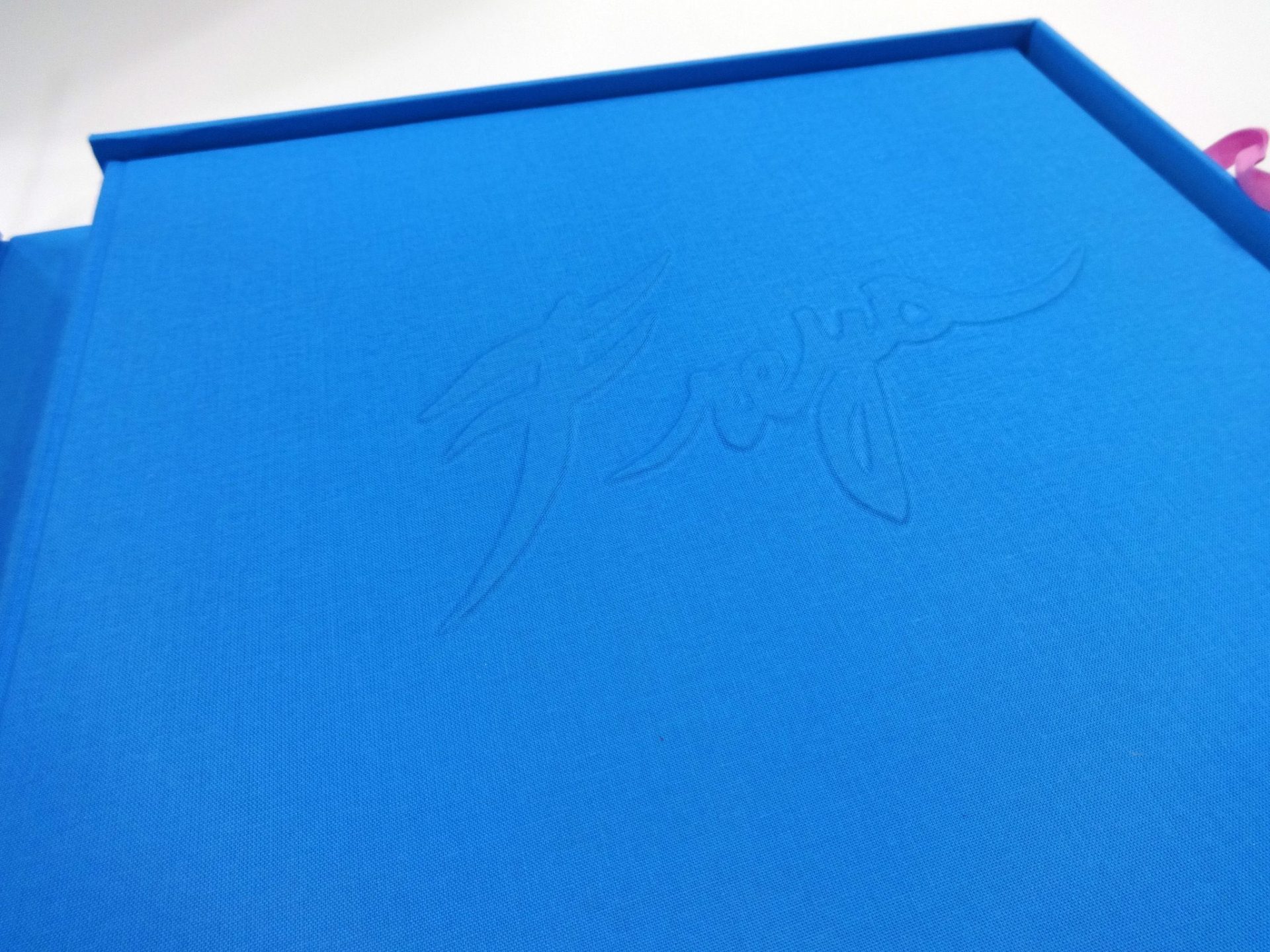 Vam escollir un color blau per a la tela de les tapes i l’estoig, i un paper fet a mà i amb pètals de flors incrustades per a les guardes del llibre i l’interior de l’estoig. El nom de la petita va gofrat a la tapa del llibre i l’estoig tanca amb uns llacets de vellut rosa, recordant les cues d’una nena.
