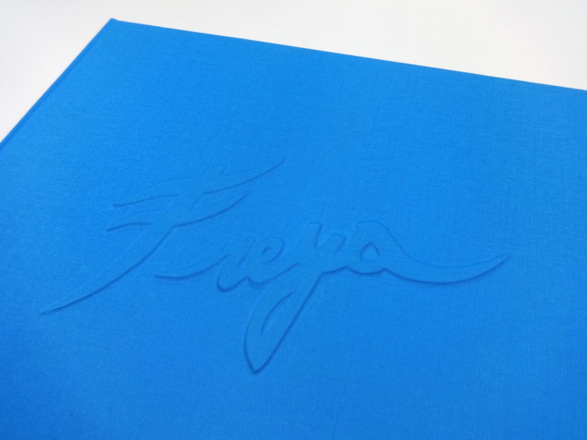 Aquest encàrrec de Víctor Ramírez és un “divertimento” com ell mateix ho va denominar. Va voler fer un regal a l’últim nadó de la família, anomenada Freya. Va crear per a ella unes fulles amb “paraules i colors” i després vaig tenir l’honor d’enquadernar-les.