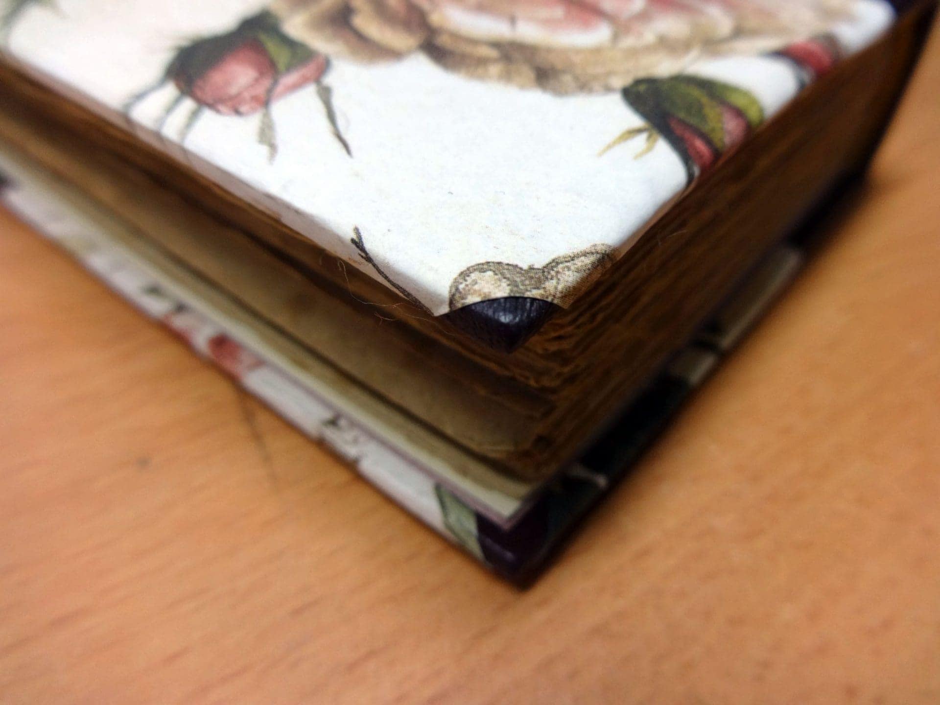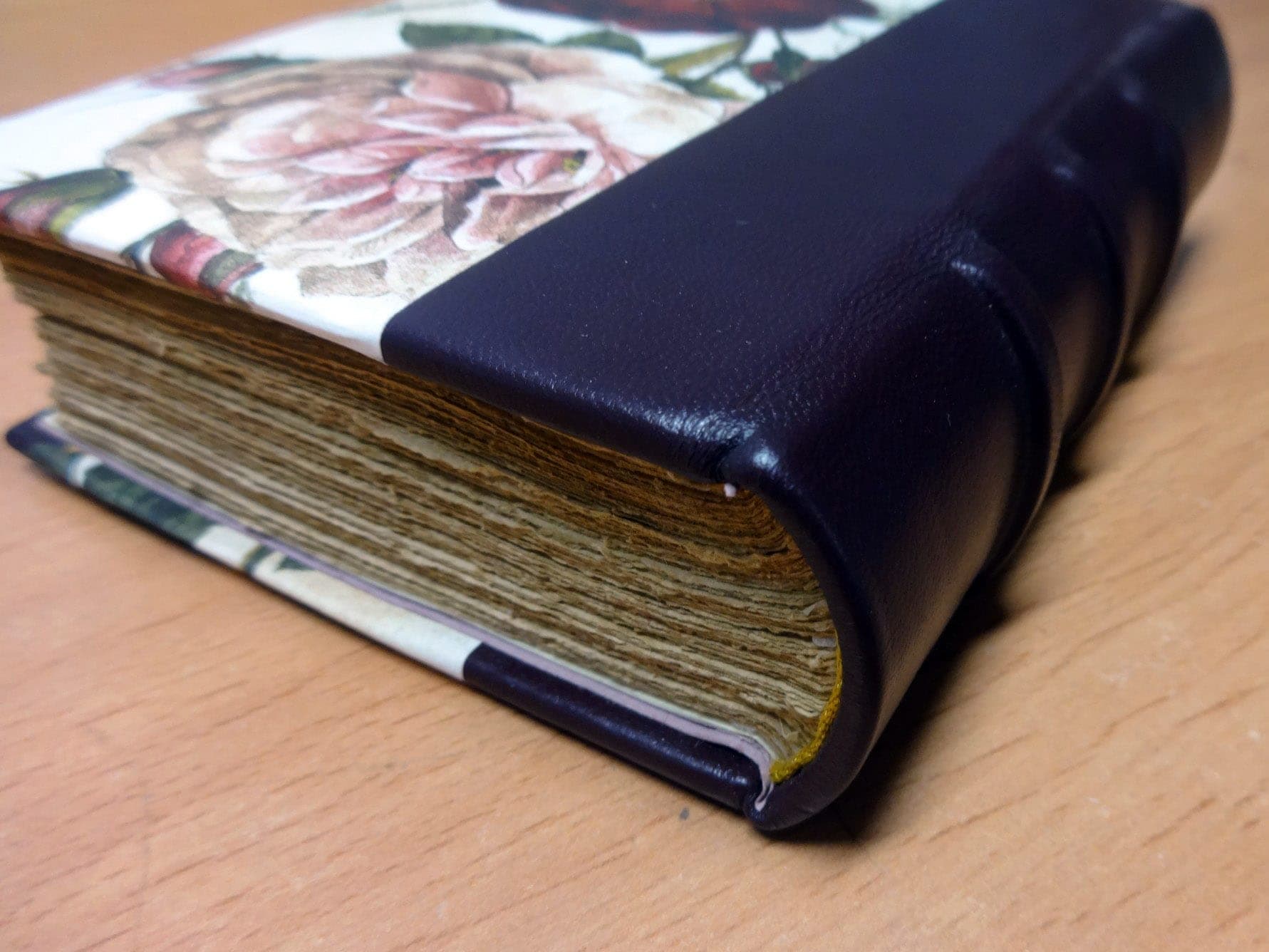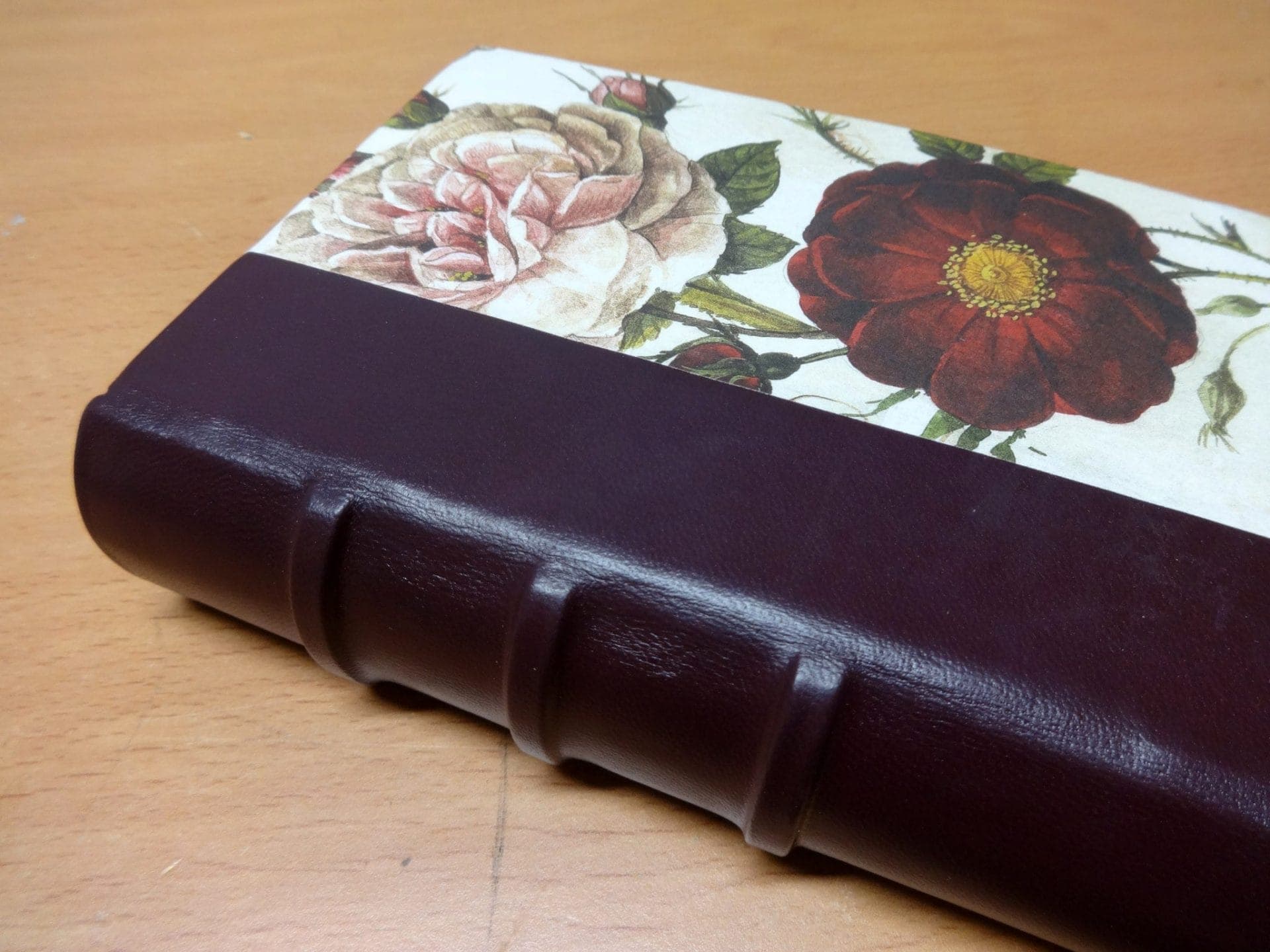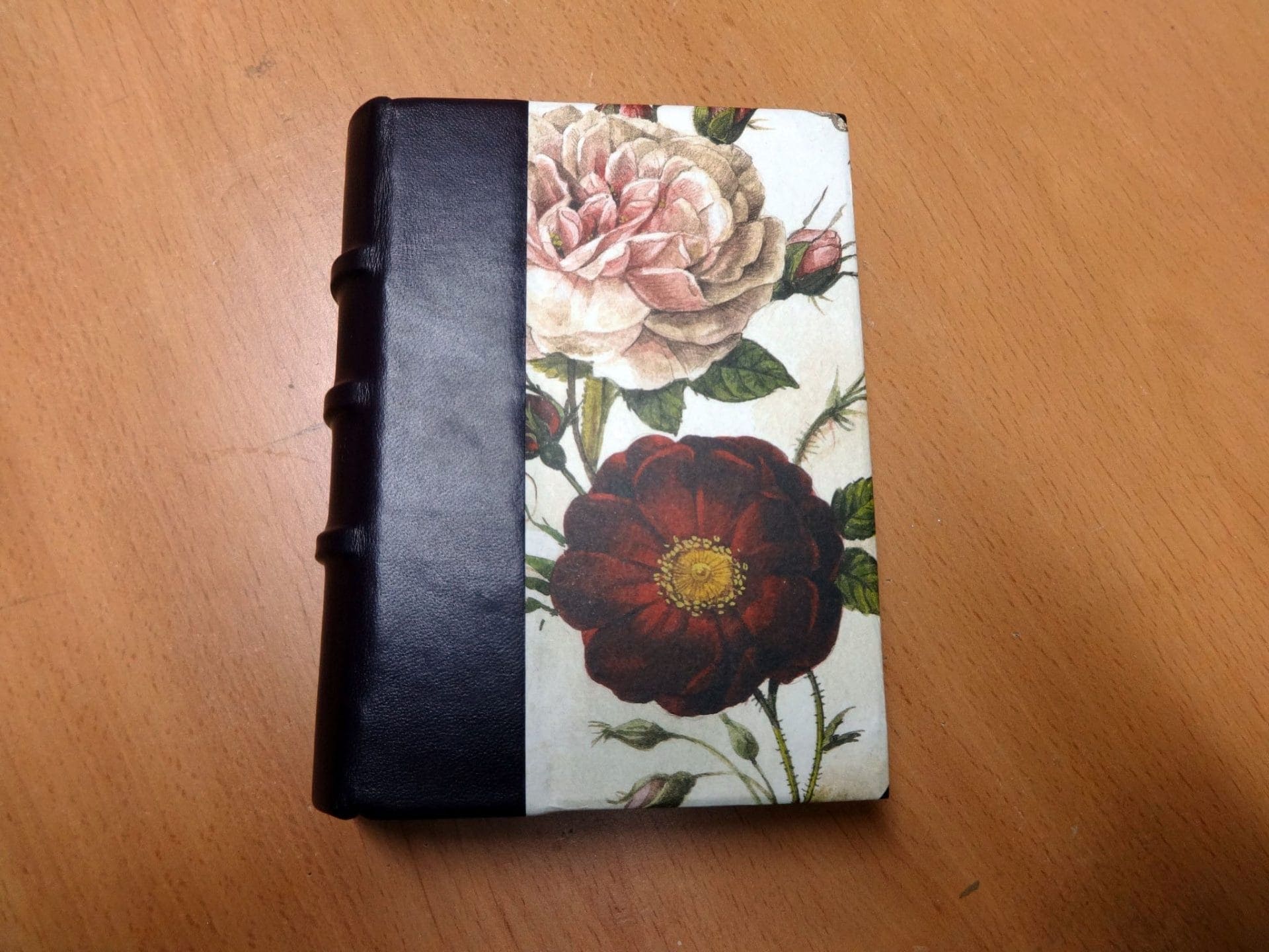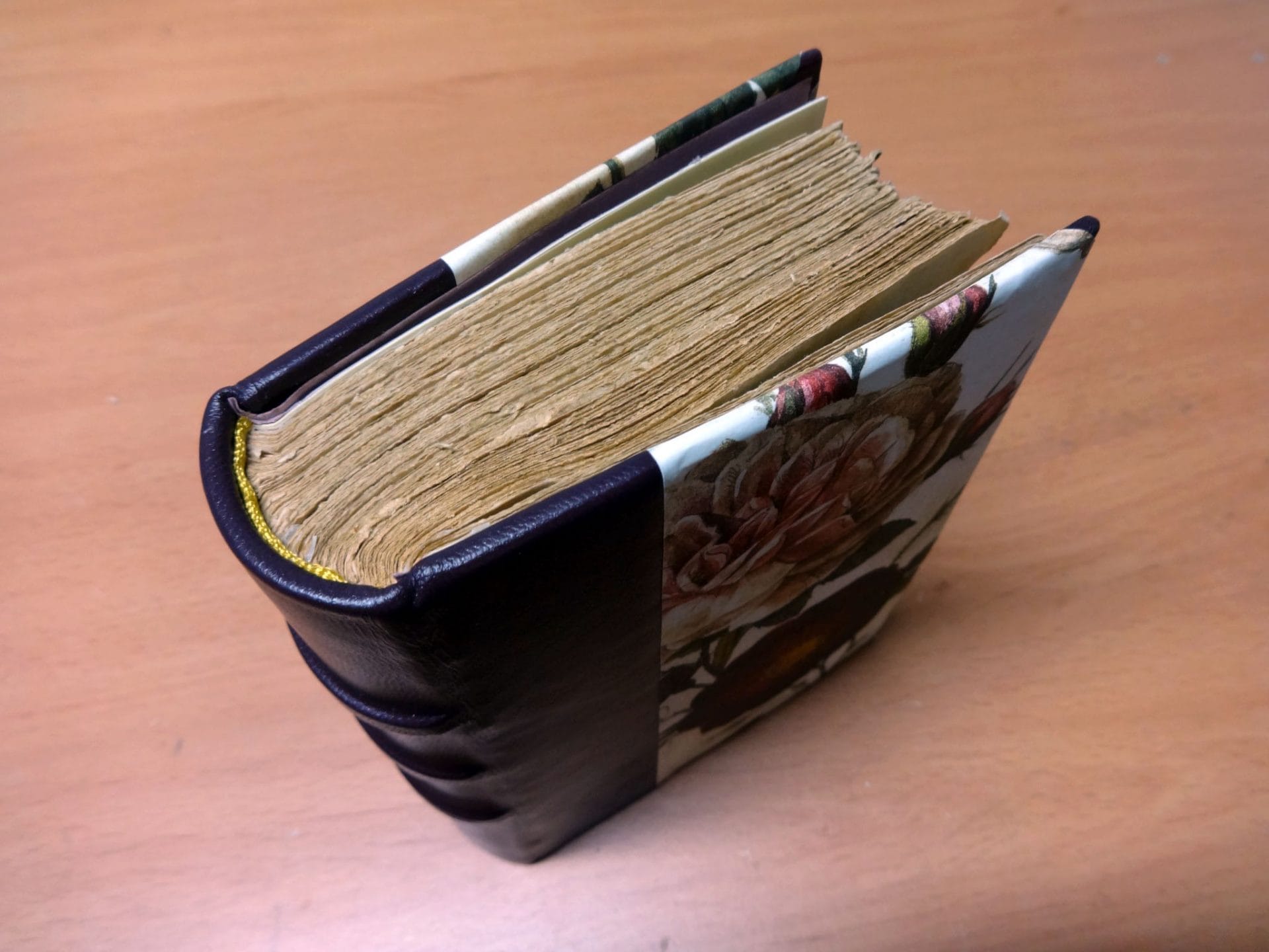 It was decided to make them half leathered, of maroon color and with a Bomoart flowers paper. I was able to fix the fold of the spine and the headcap.