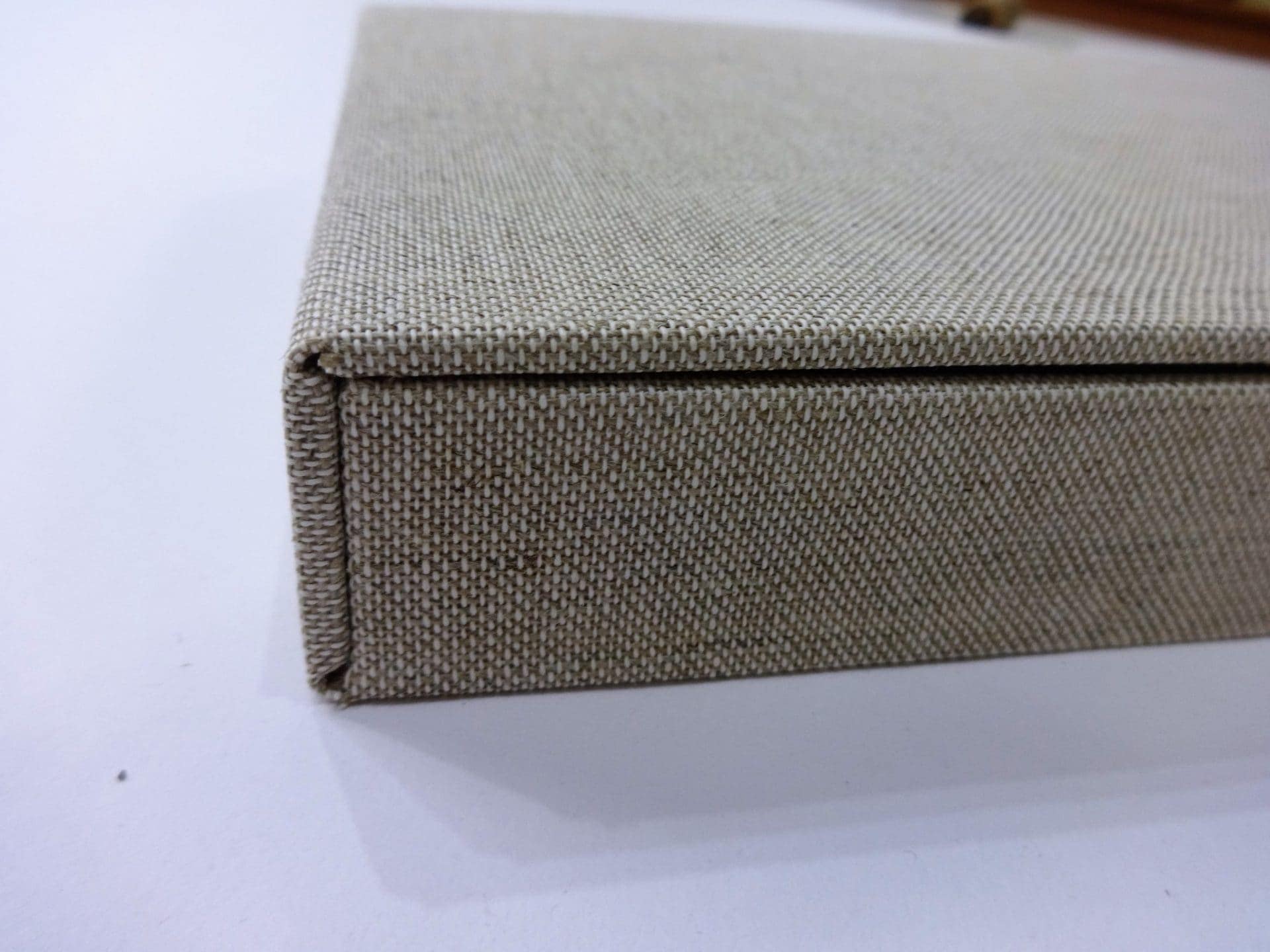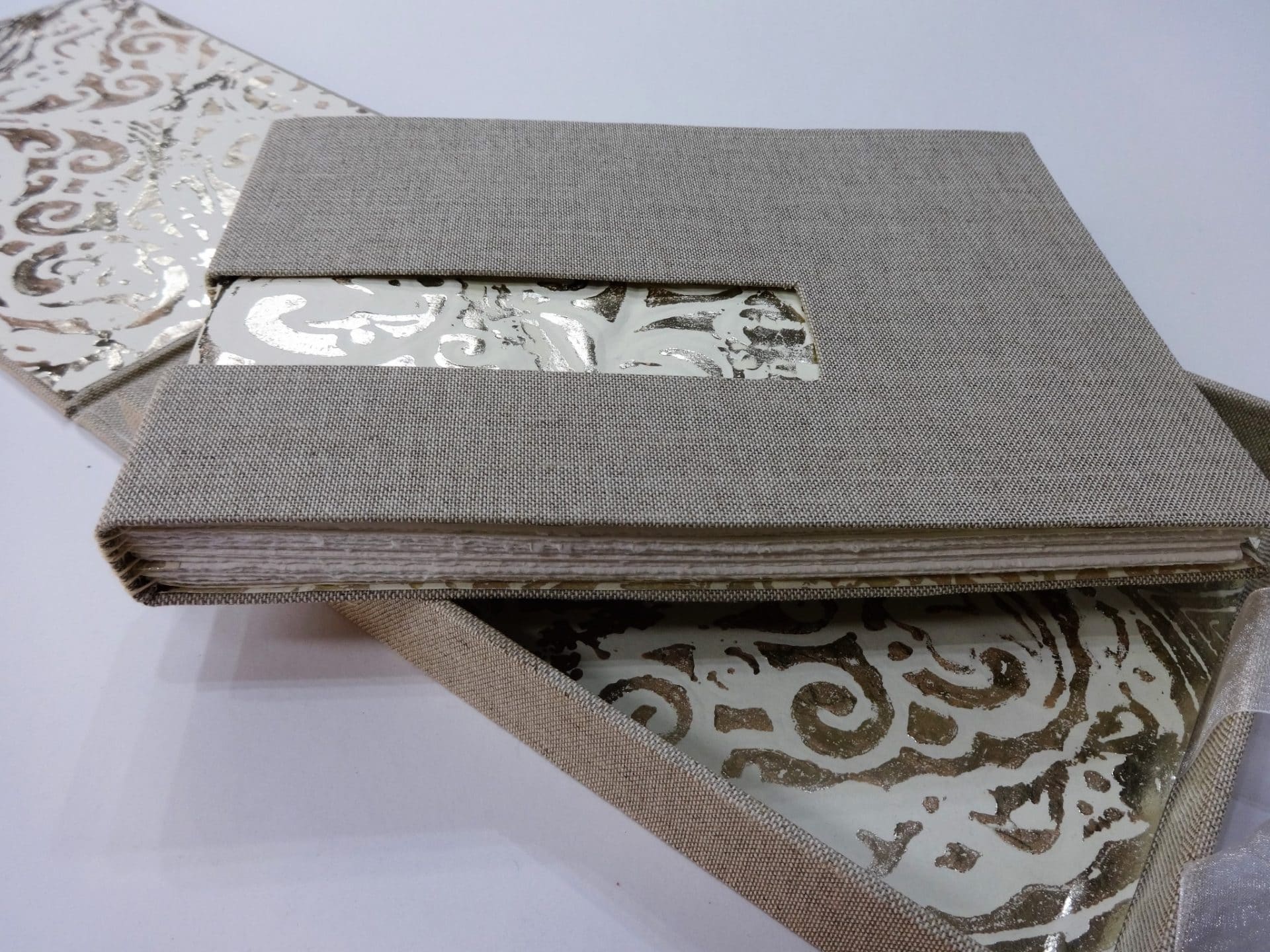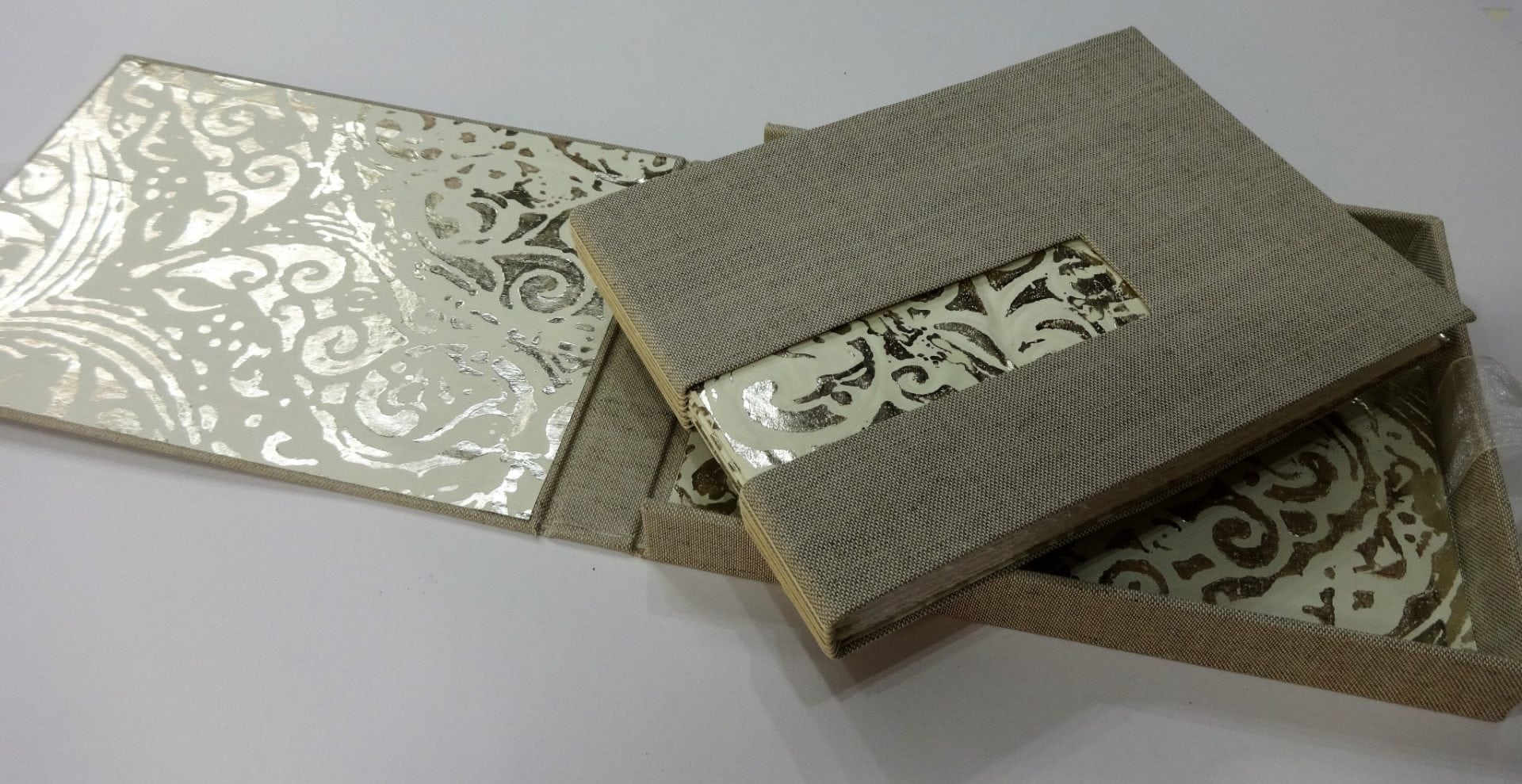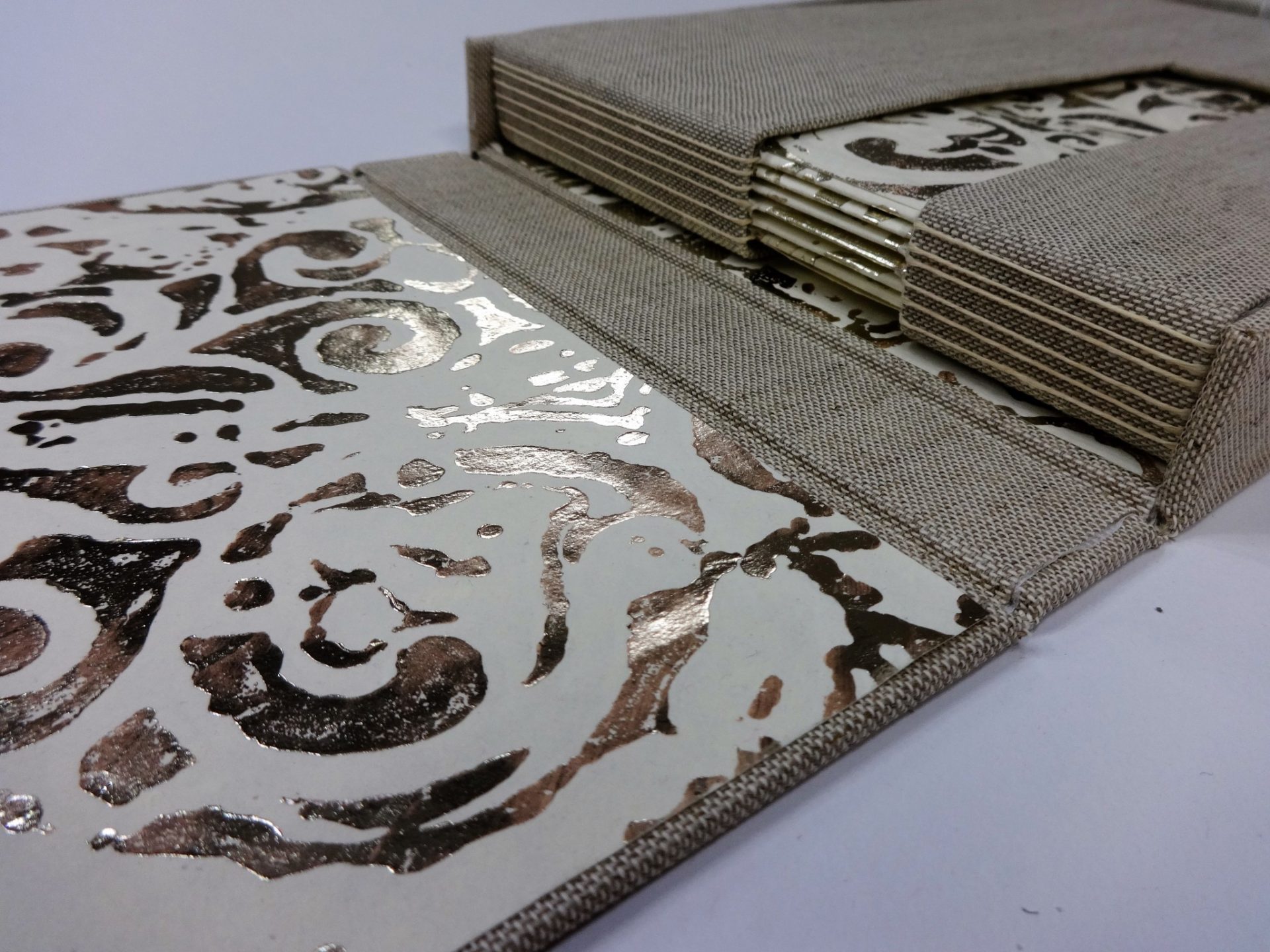 El papel con dorados me lo proporcionó la cliente, y el estuche lo hice con una combinación del papel y tela de lino.