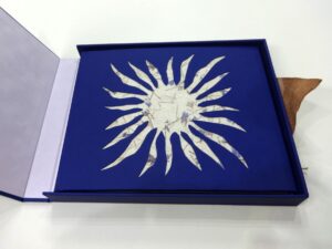 Este encargo de Víctor Ramírez es un “divertimento” como él mismo lo denominó. Quiso hacer un regalo a la última bebé de la familia, llamada Freya. Creó para ella unas hojas con “palabras y colores” y después tuve el honor de encuadernarlas.