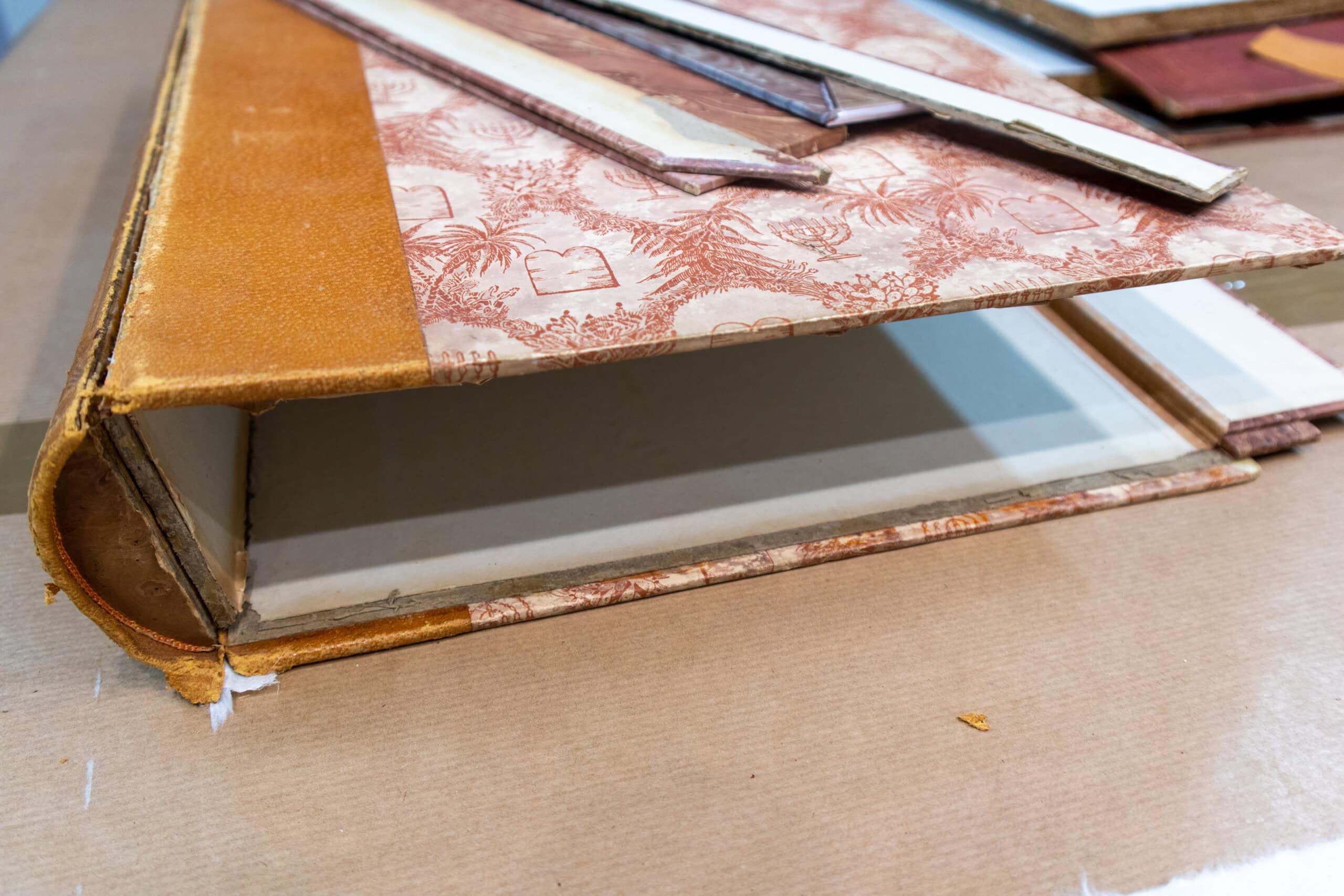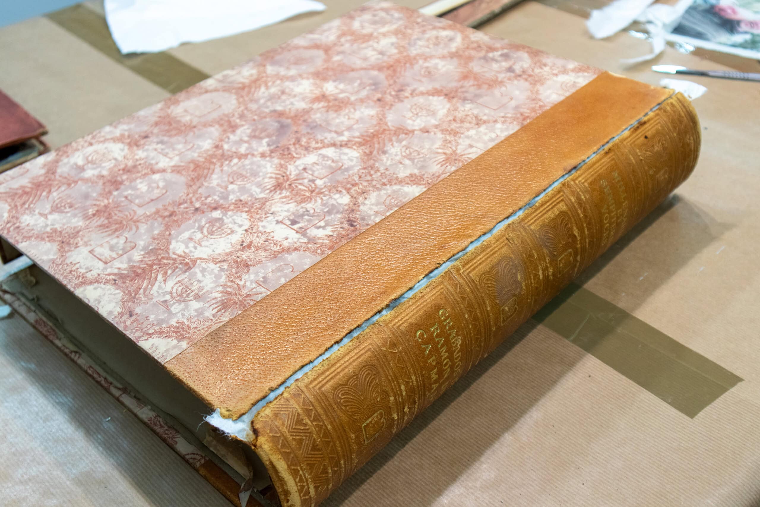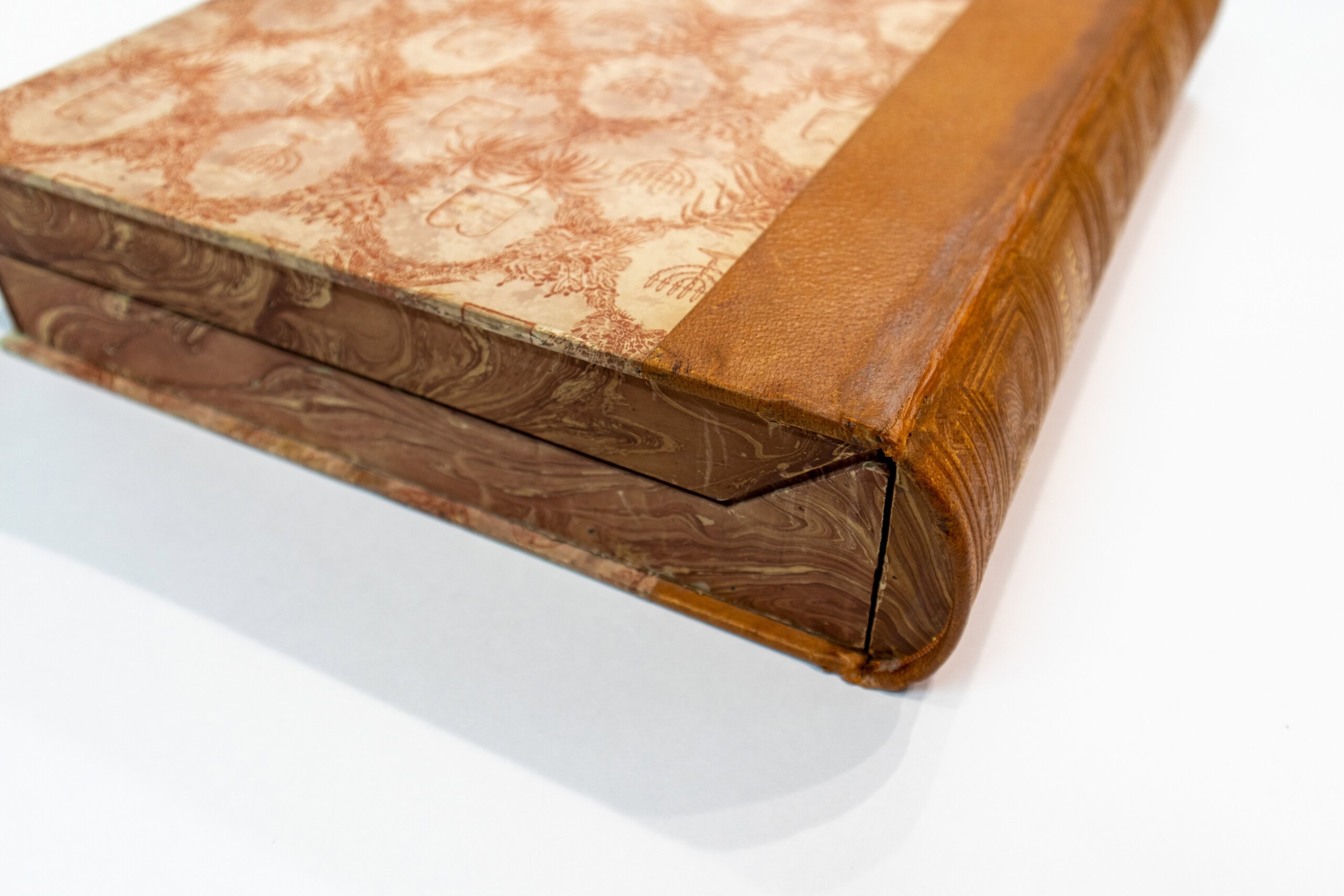 Esta restauración se trata de una caja/estuche en forma de libro que contenía grabados y laminas. La caja estaba totalmente desmontada. Se reconstruyó el lomo que era de piel con papel japón y se volvieron a montar todas las piezas del estuche para recuperar su funcionalidad.